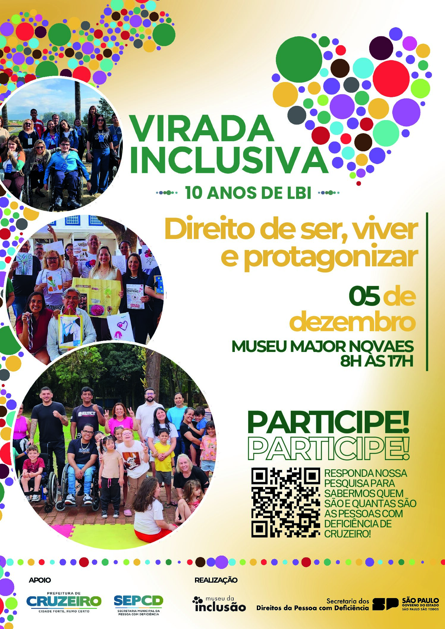 A cidade de Cruzeiro participa neste ano da Virada Inclusiva, iniciativa estadual, celebrando o tema “10 anos de LBI – Direito de ser, viver e protagonizar”, em referência à Lei Brasileira de Inclusão (LBI), marco nacional que garantiu avanços importantes na cidadania e nos direitos das pessoas com deficiência.