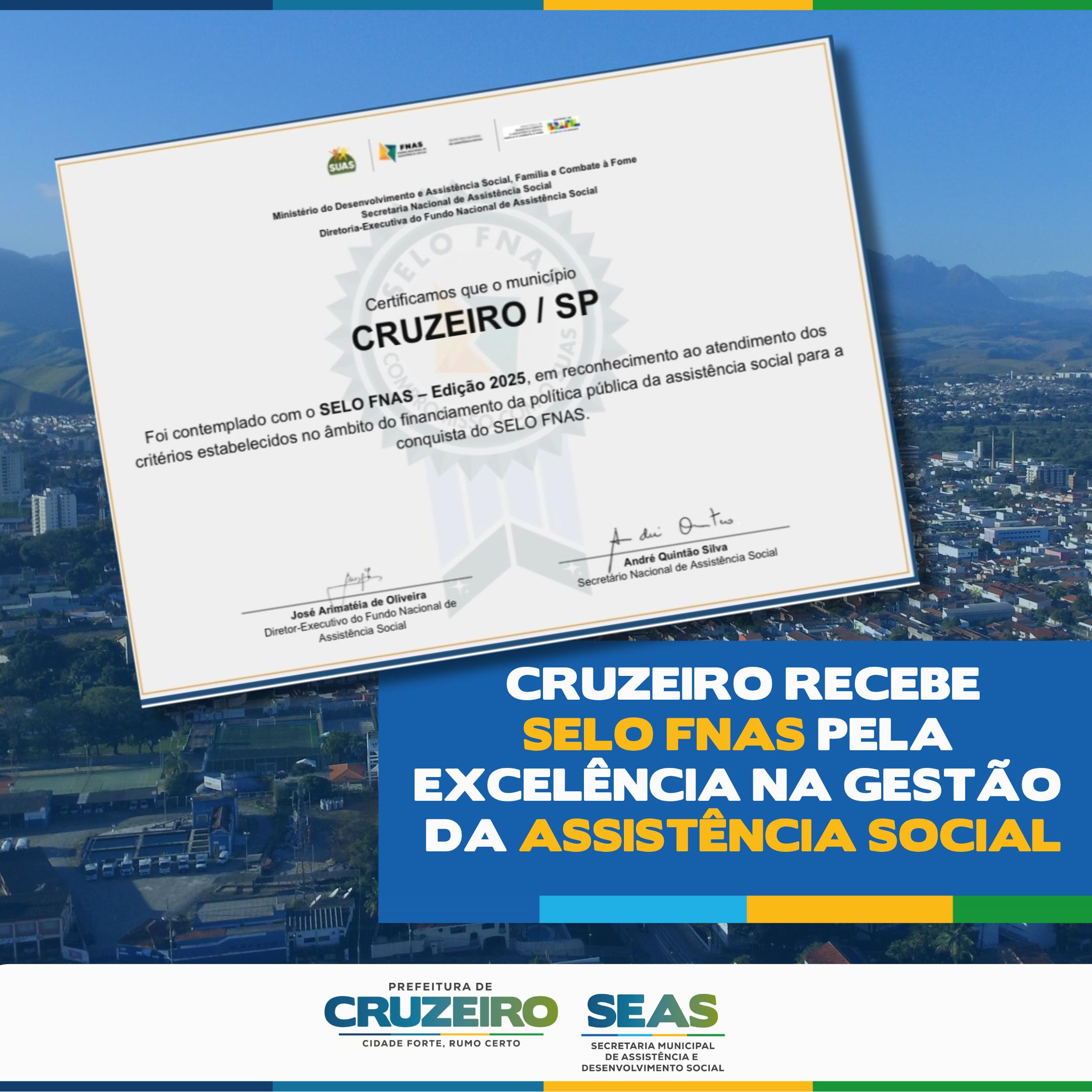 A Prefeitura de Cruzeiro, por meio da Secretaria de Assistência e Desenvolvimento Social, conquistou o Selo FNAS 2025, certificação concedida pelo Fundo Nacional de Assistência Social (FNAS) a estados e municípios que se destacam na gestão dos recursos da política de assistência social em todo o país.
