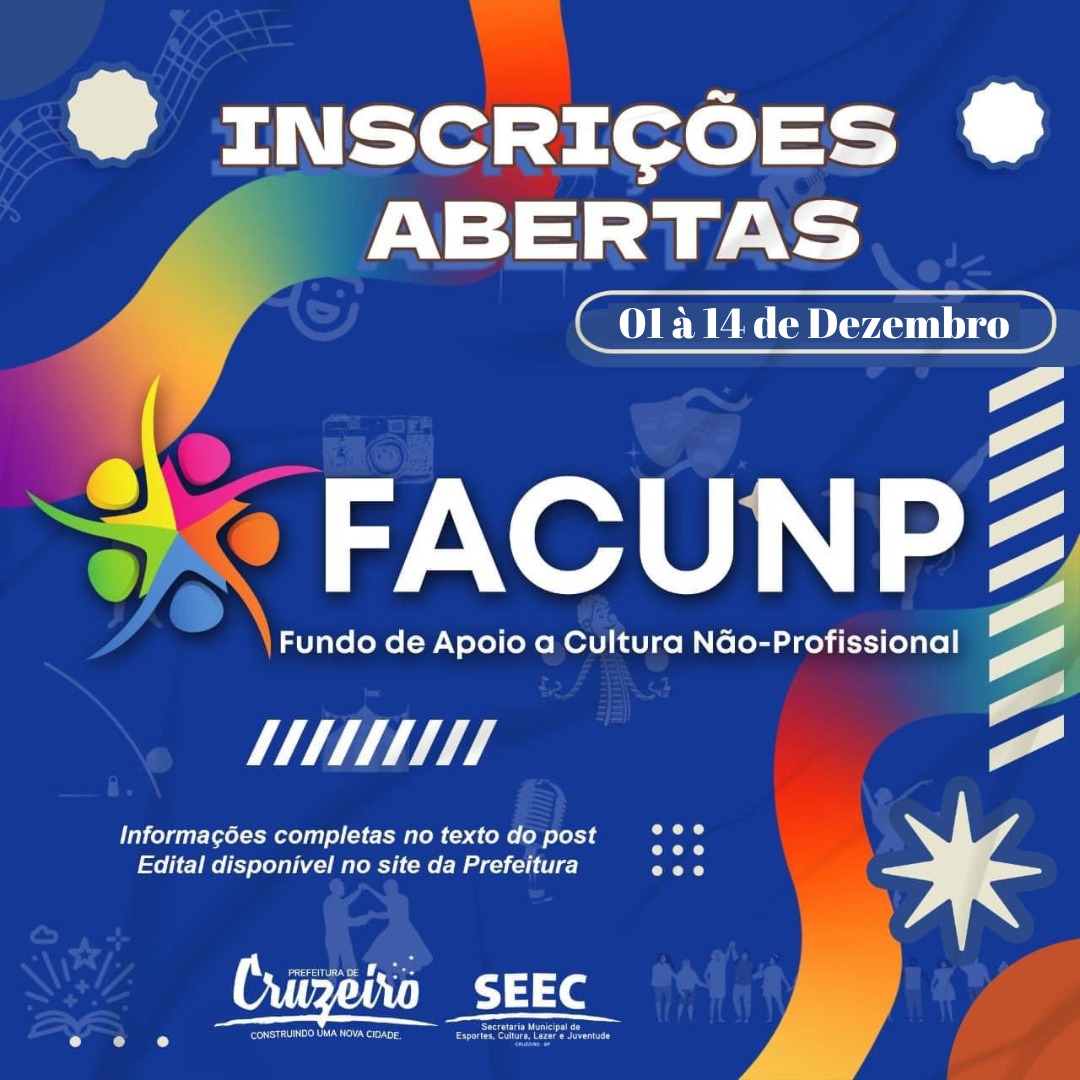 A Prefeitura de Cruzeiro, por meio da Secretaria de Esportes, Cultura, Lazer e Juventude, convoca e comunica aos interessados e fazedores de Cultura não profissionais do Município, que a partir do dia 01 de dezembro de 2022 até o dia 14 de dezembro de 2022, receberá na sede da Secretaria, localizada nas dependências do Museu Major Novaes, situado, na Rua Jorge Tibiriçá, s/n, Vila Canevari – Cruzeiro/SP, das 09 às 17 horas, de segunda a sexta-feira, propostas para a seleção de bolsistas para o desenvolvimento de atividades e projetos culturais não profissionais para o ano de 2023, cumprindo obrigatoriamente as condições estabelecidas no EDITAL 002/2022 para o FACUNP/2023 da Prefeitura de Cruzeiro.