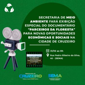 A Prefeitura de Cruzeiro, por meio da Secretaria Municipal de Meio Ambiente (SEMA), convida você para uma exibição especial do documentário “Parceiros da Floresta” (2022,