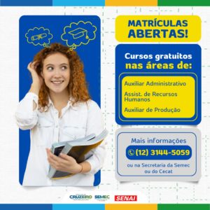 A Prefeitura Municipal de Cruzeiro, em parceria com o Senai, está oferecendo novos cursos de qualificação profissional nas áreas de Auxiliar Administrativo, Assistente de Recursos