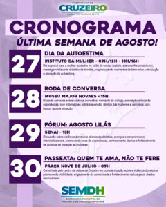 A Prefeitura de Cruzeiro, por meio da Secretaria Municipal da Mulher e de Direitos Humanos (SEMDH), encerra nesta semana a programação do Agosto Lilás, mês