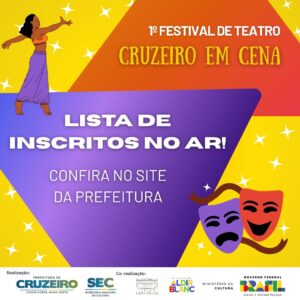 Prefeitura de Cruzeiro divulga lista de inscritos no 1º Festival de Teatro “Cruzeiro em Cena” A Prefeitura de Cruzeiro, por meio da Secretaria Municipal