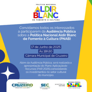 A Prefeitura de Cruzeiro, por meio da Secretaria Municipal de Cultura, convida toda a população para participar da Audiência Pública da Política Nacional Aldir