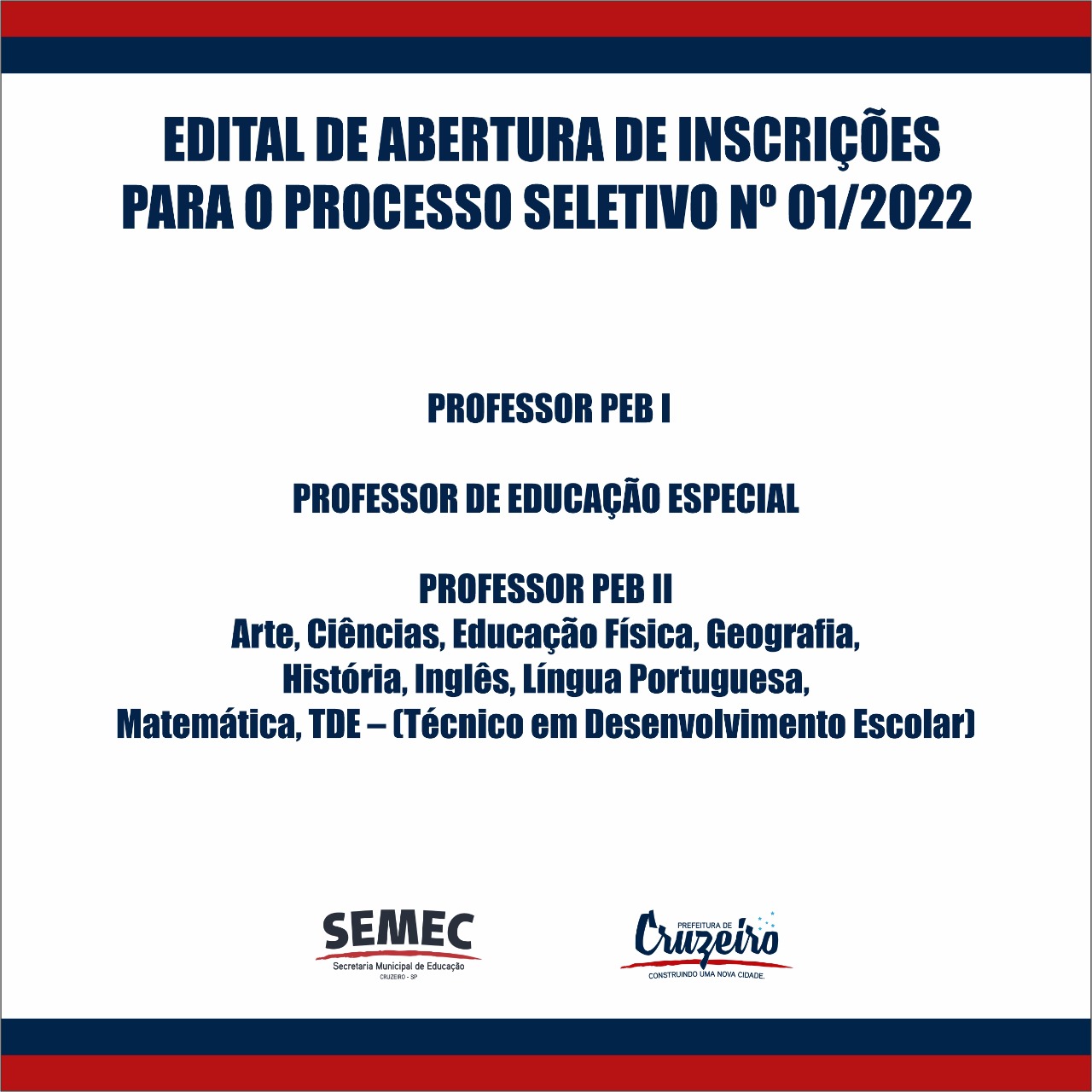 A Prefeitura de Cruzeiro, por meio da Secretaria de Educação, torna público o EDITAL DE ABERTURA DE INSCRIÇÕES PARA O PROCESSO SELETIVO Nº01/2022 visando à formação de Cadastro de Reserva para as funções, em regime de contratação temporária, de Professor e Técnico em Desenvolvimento Escolar, o qual se processará de acordo com as instruções constantes no edital e na legislação complementar concernente à matéria.